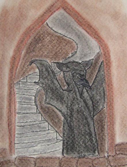 Der Eingang zum Büro des Schulleiters befindet sich im siebten Stock hinter einem großen, besonders hässlichen Wasserspeier, der das Passwort entgegennimmt.