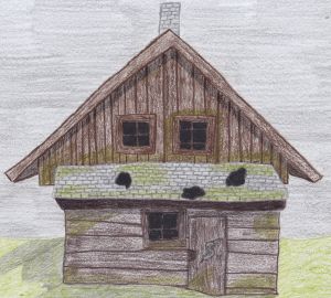 Der Innenraum der Hütte ist ebenso kärglich und verwahrlost wie das ganze Haus. Man betritt einen großen Raum, der als Wohnzimmer und Küche genutzt wird. Neben dem verrußten Kamin steht ein abgewetzter Sessel. An der Wand sind Regale mit Töpfen zu sehen. Vom Zimmer aus führen zwei Türen in kleinere Räume, die wohl als Schlafräume genutzt werden.