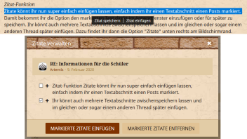 Zitate könnt ihr nun sehr einfach einfügen lassen, indem ihr einen Textabschnitt in einem Post markiert. Damit bekommt ihr die Option, den markierten Text direkt im Antwortfenster einzufügen oder für später zu speichern. Ihr könnt auch mehrere Textabschnitte zwischenspeichern lassen und im gleichen oder sogar einem anderen Thema zu einem späteren Zeitpunkt einfügen. (siehe Bild im Anhang) Dazu findet ihr dann die Option "Zitate" unten rechts am Bildschirmrand.